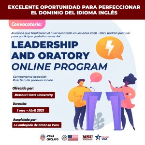 Si has sido alumno del ICPNA Chiclayo y has concluido el nivel avanzado entre enero 2020 y febrero 2021, te ofrecemos una excelente oportunidad de postular para obtener una de las 12 vacantes para participar en un “Leadership and Oratory Online Program  para que puedas desarrollar tu pronunciación y fluidez en el idioma inglés.